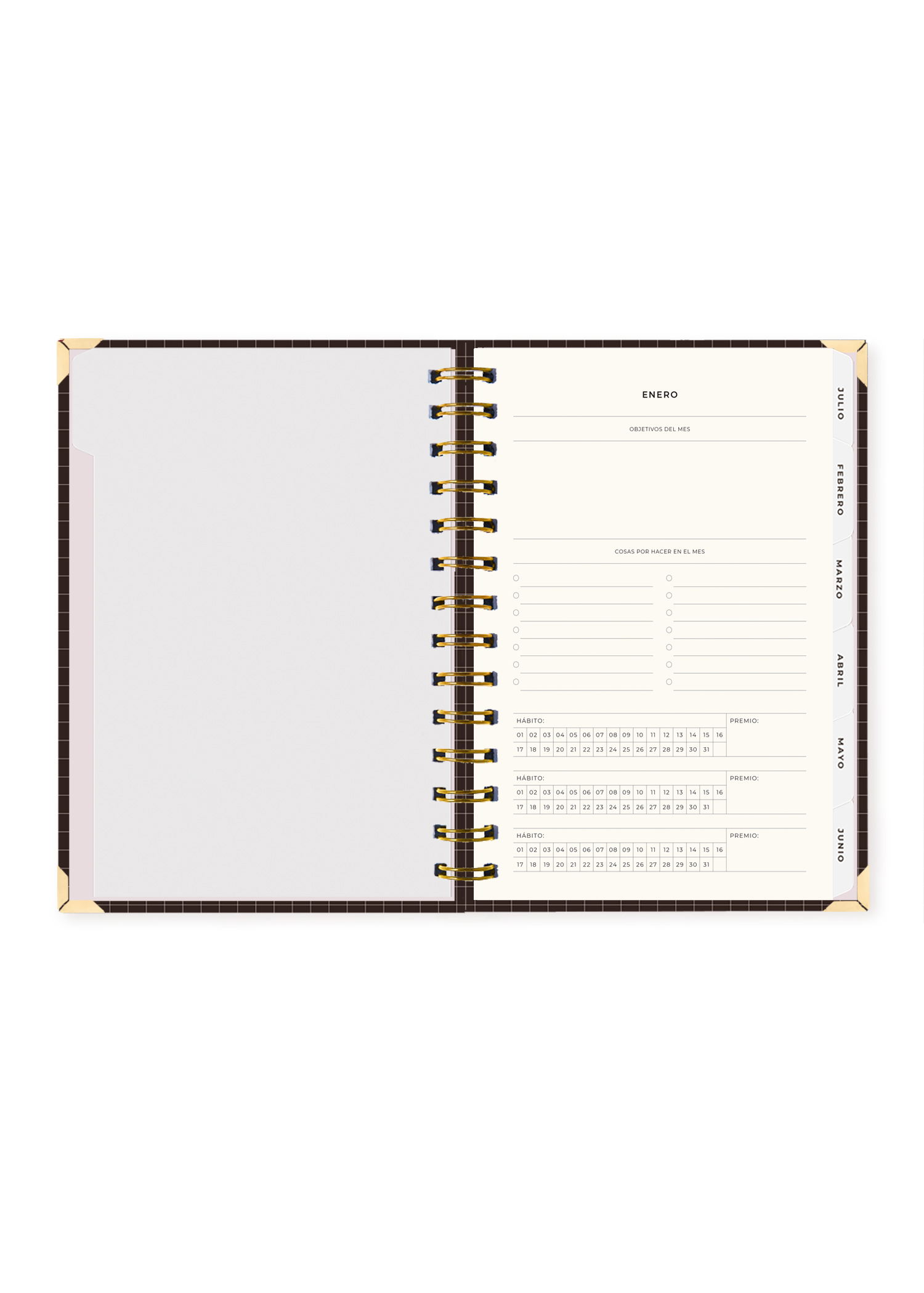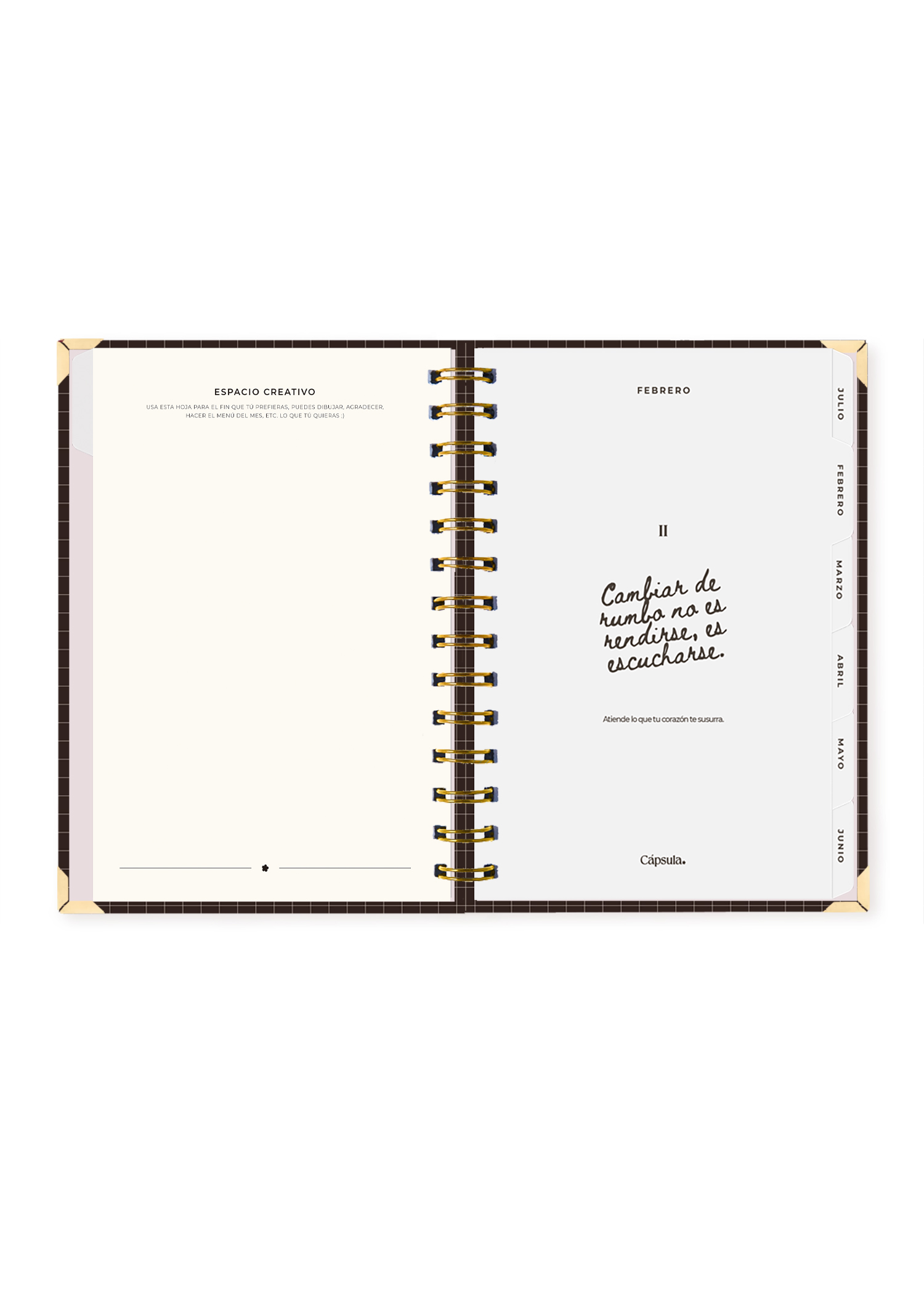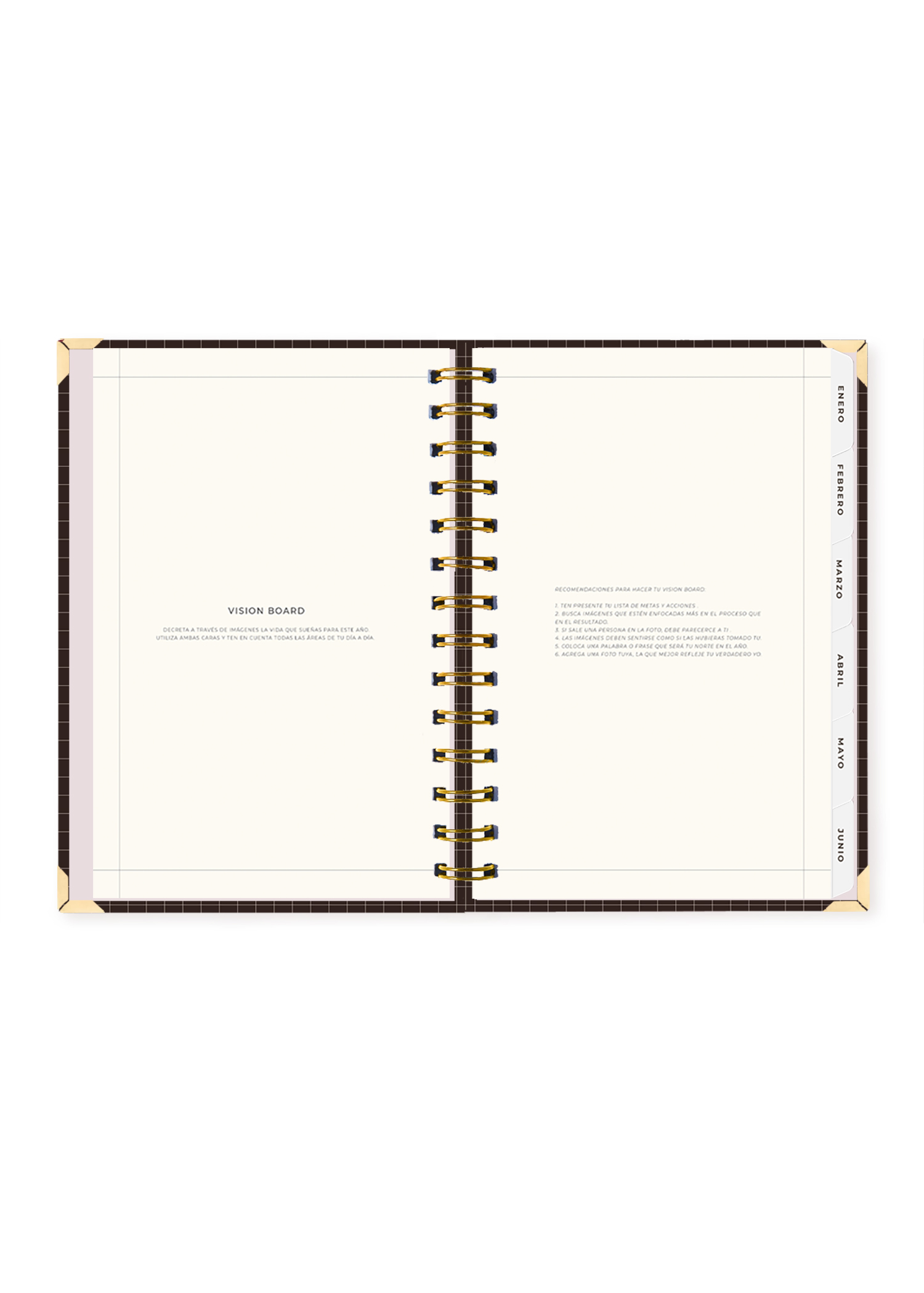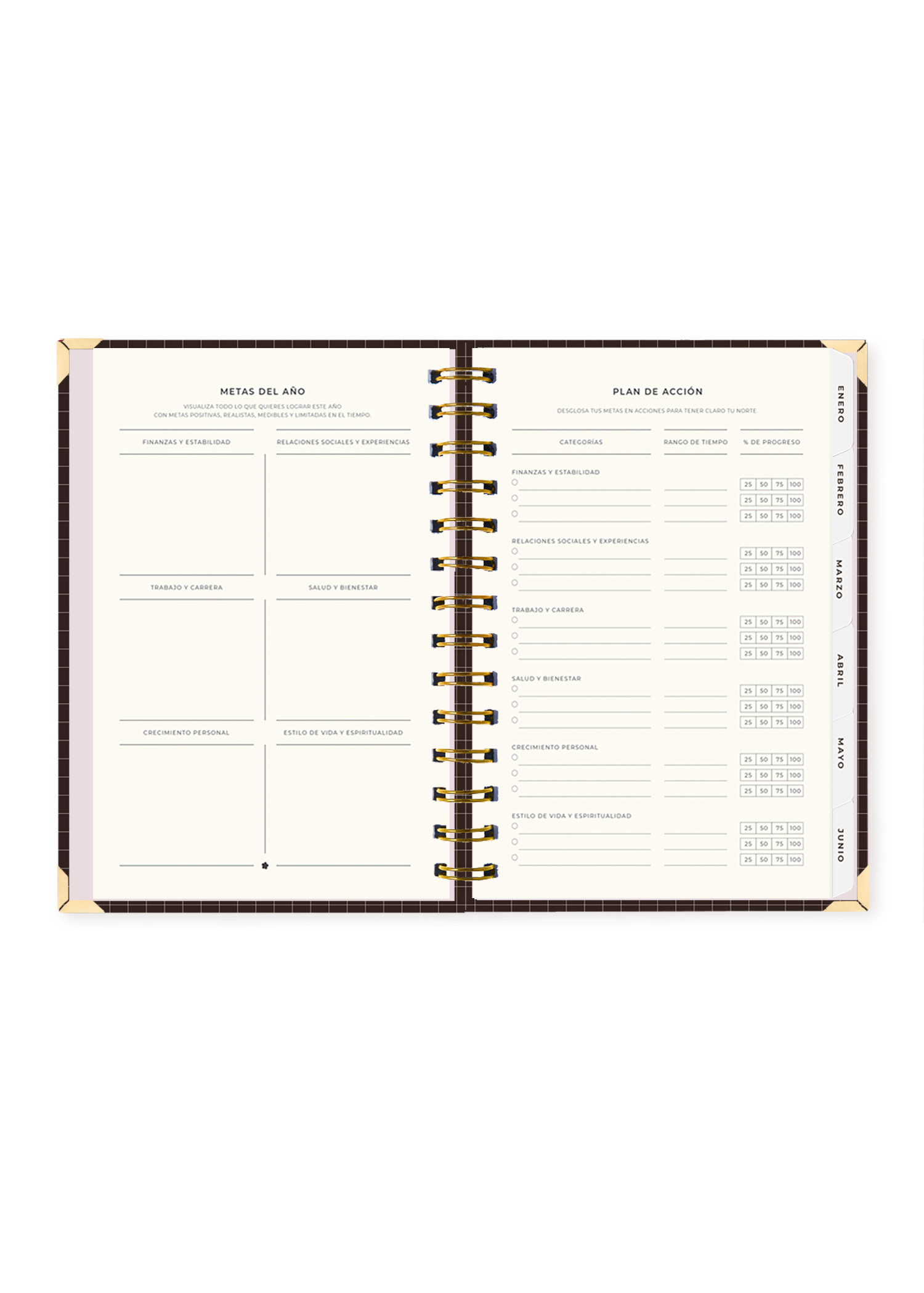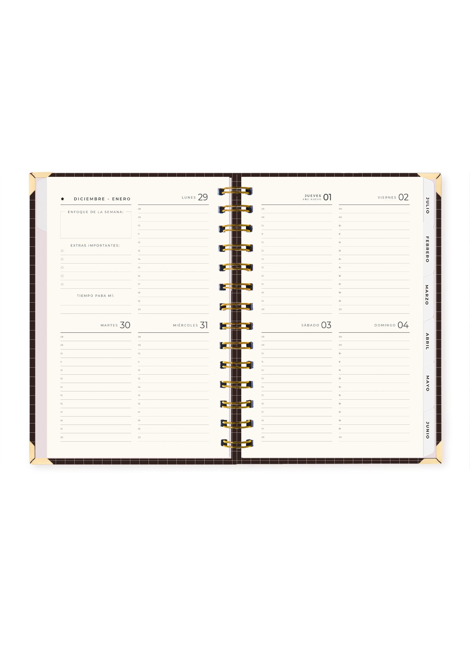 La tapa es dura y protegida, hecha con cartón Kappa y plastificado arenado premium que brinda una textura elegante y duradera. Incluye foil dorado mate en los detalles de portada que brillan delicadamente con la luz. Cuenta con esquineros metálicos dorados y elástico para mantenerla cerrada. El anillado metálico permite que se abra completamente sin dañar las hojas.